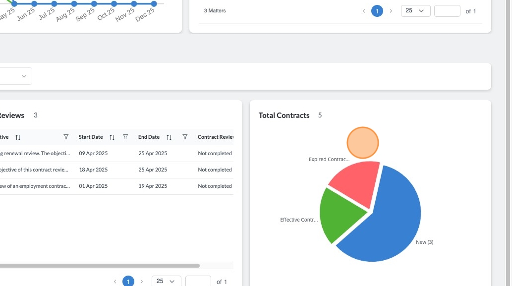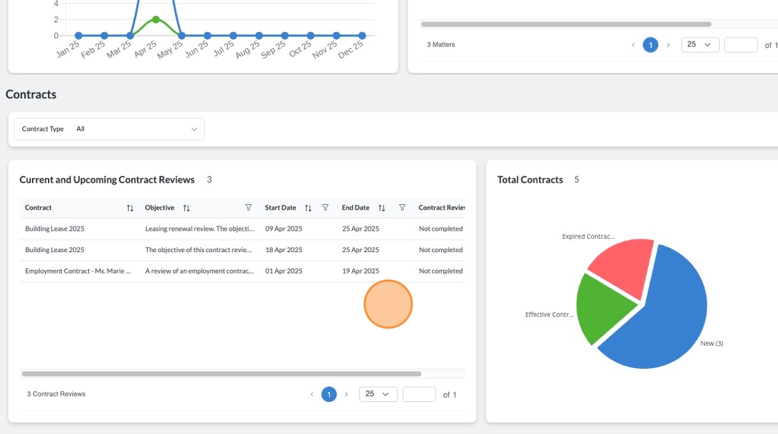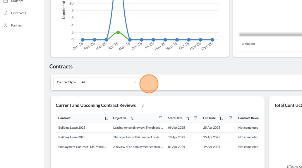 5. The Contracts portion of the dashboard allows you to view Contract Statuses and Current and Upcoming Contract Reviews for all your contracts types or for a specific contract type.