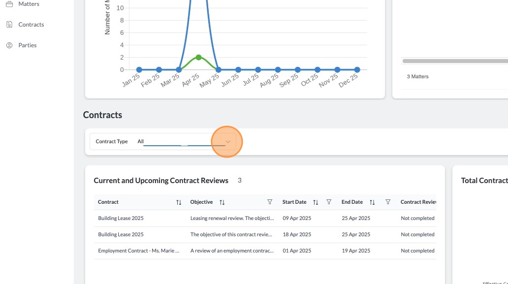 6. To filter the Contracts charts by a specific contract type, click on the Contract Type dropdown and select from your list of Contract Types.