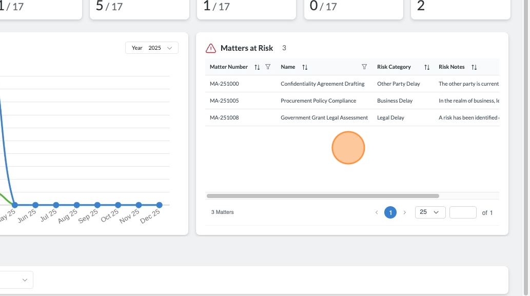 4. The Matters at Risk Table is a grid of matters that have been marked as "At Risk" by the legal team. This is a useful dashboard table that you can quickly refer to and discuss why matters are at risk of not completing in time.