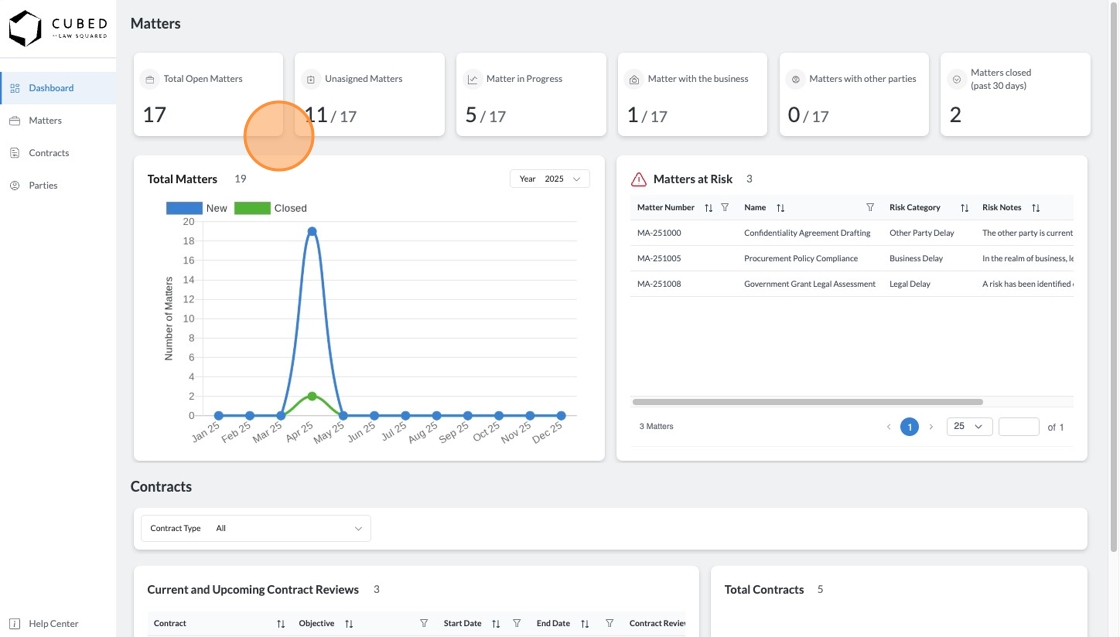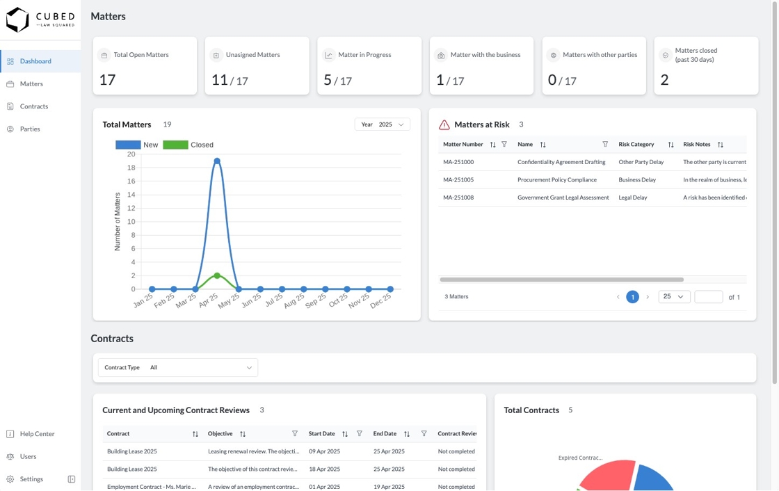 1. The Cubed by Law Squared Dashboard is a simple yet effective way to see key metrics and datapoints relating to your Matters and Contracts.