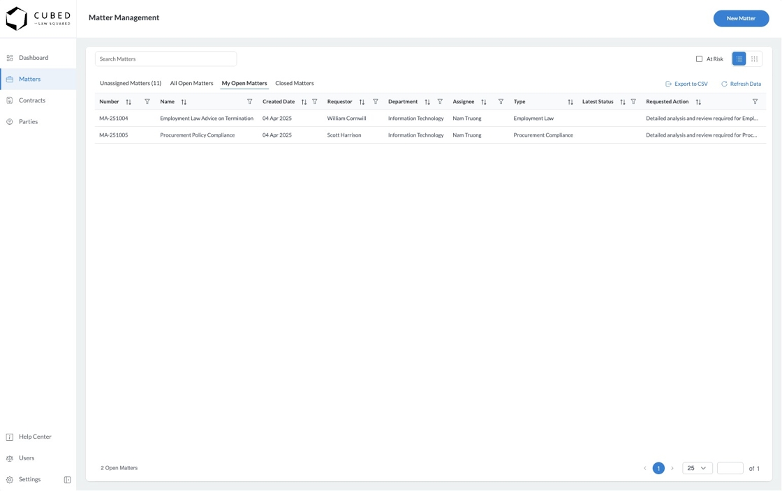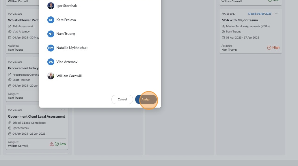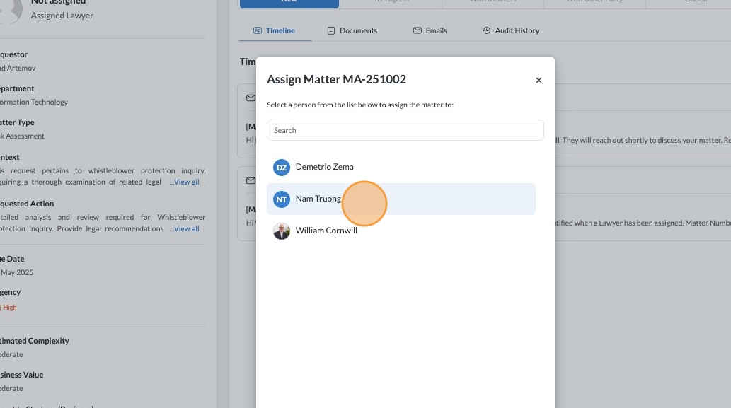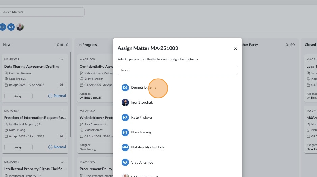 1. Within the Matters Module you can assign matters to your legal team members for action.