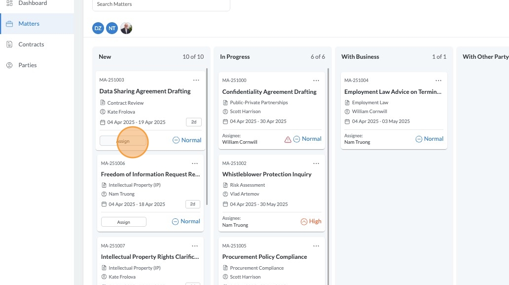 9. From the Board View, click on the "Assign" button on an unassigned matter.